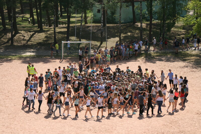 Nach der Anreise am Freitagvormittag startete das Camp am Nachmittag mit einer großen gemeinsamen Aktion, bei der alle eine lange Menschenkette bildeten, die sich zu einer „Schnecke“ zusammenrollte. Das nun gebildete „Menschenknäuel“ wurde mit einem Band umrundet, welches von drei Konfirmanden durchschnitten wurde. Damit stoben alle auseinander und das Camp war somit offiziell eröffnet.