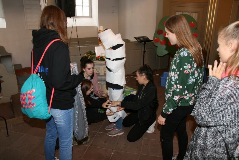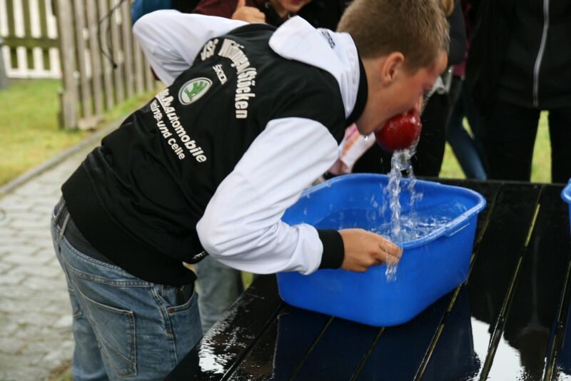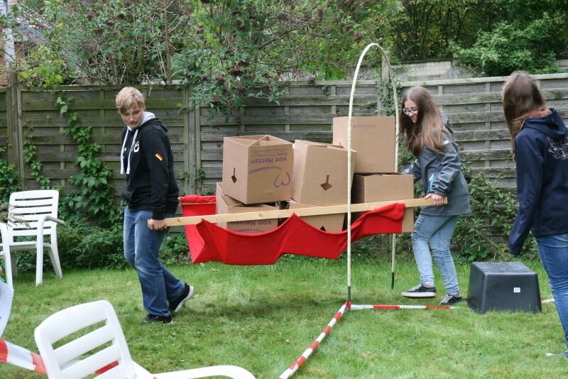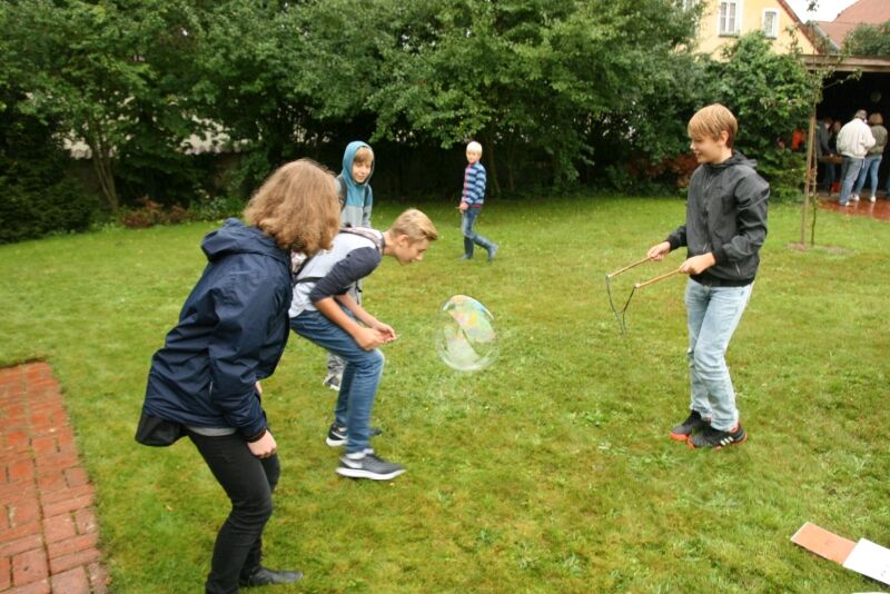 Die Konfirmanden erwarteten 15 verschiedene Stationen, die zu biblischen Themen Wissensfragen gestellt bekamen und dann gleich praktisch anwenden konnten. So gab es Geschicklichkeitsparcours mit Kerzen oder einer Trage zu überwinden, Nägel in einen Balken zu schlagen oder möglichst große Seifenblasen fliegen zu lassen. Das Küchenteam der Kirchengemeinde Brome versorgte die hungrigen Jugendlichen mit Hot Dogs und Getränken.