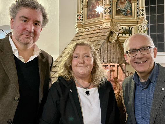 Legendär ist, dass Margret Albs jedes Jahr im Advent Kinder zu Engeln ausbildet. Und das seit Jahrzehnten. Als lebendiger Vorhang fungiert zwischen den einzelnen Szenen des weihnachtlichen Krippenspieles der Albs’sche Engelchor und singt dabei Weihnachtslieder. „Es gibt Kinder, die über Jahre hinweg immer wieder dabei sind, bis sie als Konfirmand:innen dann die Rolle wechseln müssen“, schmunzelt Gemeindepastor Heitkamp. „Ich freue mich sehr, dass Margret Albs nun von Superintendent Christian Berndt das Silberne Facettenkreuz erhalten hat.“